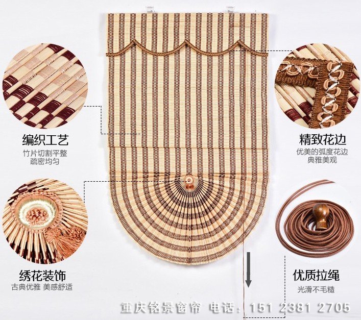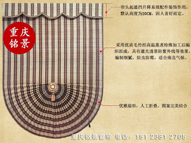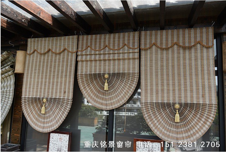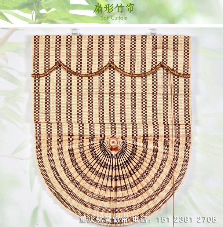 扇形竹帘和卷式竹帘区别之一就在于下方的不同,卷式竹帘下面无扇形,扇形竹帘下方为半圆型,呈现处理像一把扇子,所以统称为扇形竹帘。适用于茶楼、书房、庭院等地方。