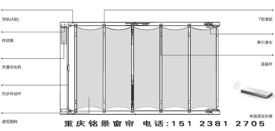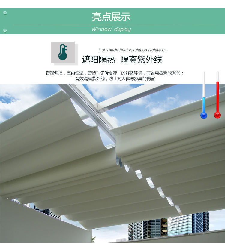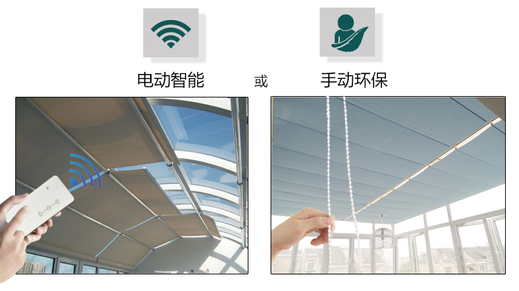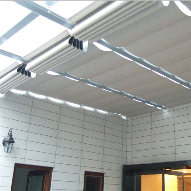 电动天棚帘是适用于玻璃幕墙顶棚的室内或家庭双轨平动遮阳帘系统。它可以制成平面,也可以制成圆弧曲面。该机构系统动力,部分是采用电动智能控制系统制作。电动天棚帘最大优点为智能控制,遮阳隔热,是针对大面积而设定的。