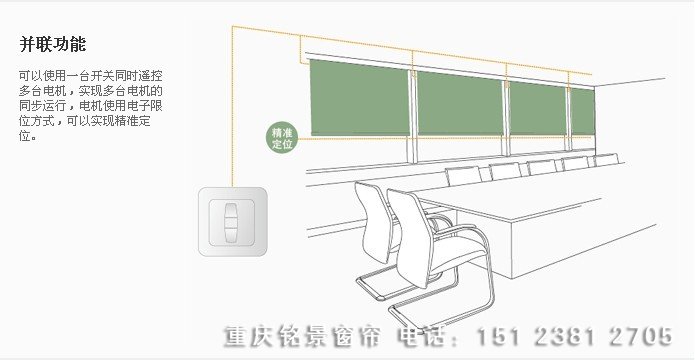 电动卷帘窗帘 可采用“一拖多”的形式,在机构中增加平衡器或万向节,使一个电机同时拖动多副面料。当电机运转时,多块面料一起作升降运动,以达到更好遮光和遮阳的效果。 采用220V交流管状电机。电机噪音小,行程调试简单方便,行程控制精确、可靠;根据负载重量、升降高度,成本造价等因素选择电机品种及型号;根据卷帘的高度、可以选用直径为50mm,70mm或100mm的卷帘管;配合全面遮光要求,在卷帘两侧,可以安装专用的遮光槽。