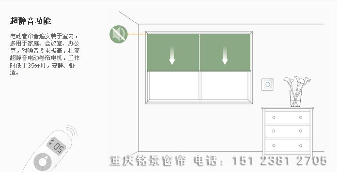 电动卷帘窗帘 机构是专用管状电机的一种轻型电动化卷帘机构,电机直接安装在卷管内,减少了窗帘箱的体积和力的传动环节,避免了外界对电机的影响,增加了机构的可靠性。 它的操作只需拨动电源开关,操作简便、工作安静平稳,是手动卷帘的一种升级换代产品。