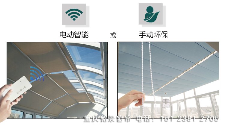 手动折叠式天棚帘是适用于小型玻璃幕墙顶棚的室内或家庭双轨平动遮阳帘系统。它可以制成平面,也可以制成圆弧曲面。该机构系统动力部分是采用循环拉珠助力系统制作,与电动折叠式天棚帘的效果一样。 手动天棚帘最大优点为造价成本低,是针对小面积而设计。