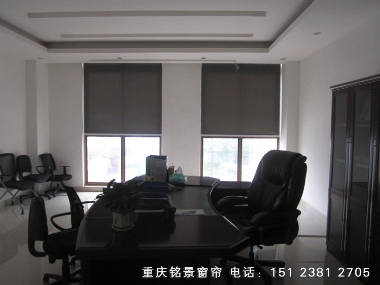 重庆渝北松芝置业有限公司办公室卷帘安装案例实拍图,应用产品:阳光面料卷帘,手动拉珠式。