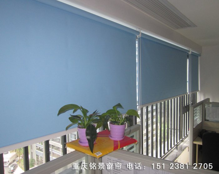 重庆渝北区某医药公司办公室卷帘实拍案例,客户选择的是双面同色全遮光卷帘,手动拉珠式。