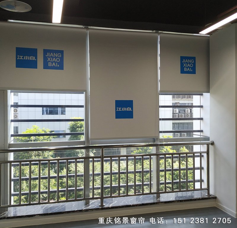 重庆渝北区江小白办公室卷帘印LOGO案例实拍图,客户选择的是全遮光加厚面料,正面采用蓝色LOGO,手动拉珠上。