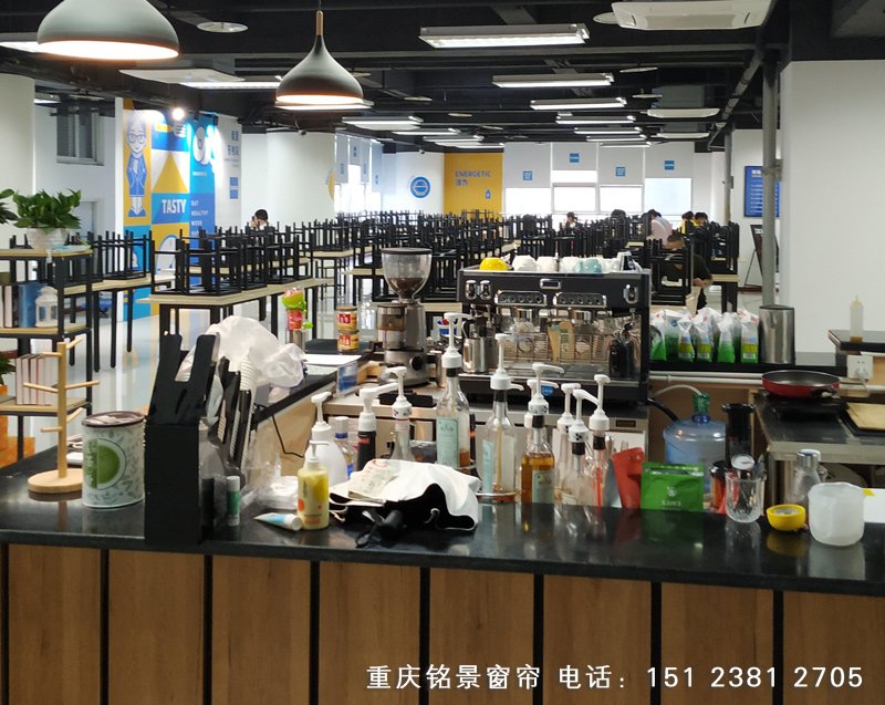 重庆渝北区江小白办公室卷帘印LOGO案例实拍图,客户选择的是全遮光加厚面料,正面采用蓝色LOGO,手动拉珠上。