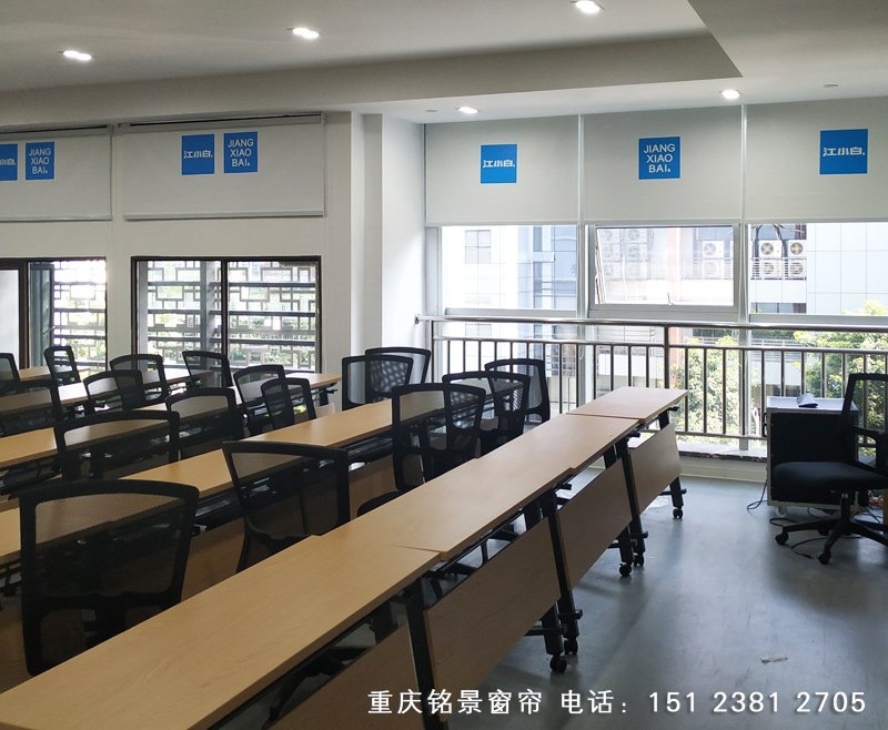 重庆渝北区江小白办公室卷帘印LOGO案例实拍图,客户选择的是全遮光加厚面料,正面采用蓝色LOGO,手动拉珠上。