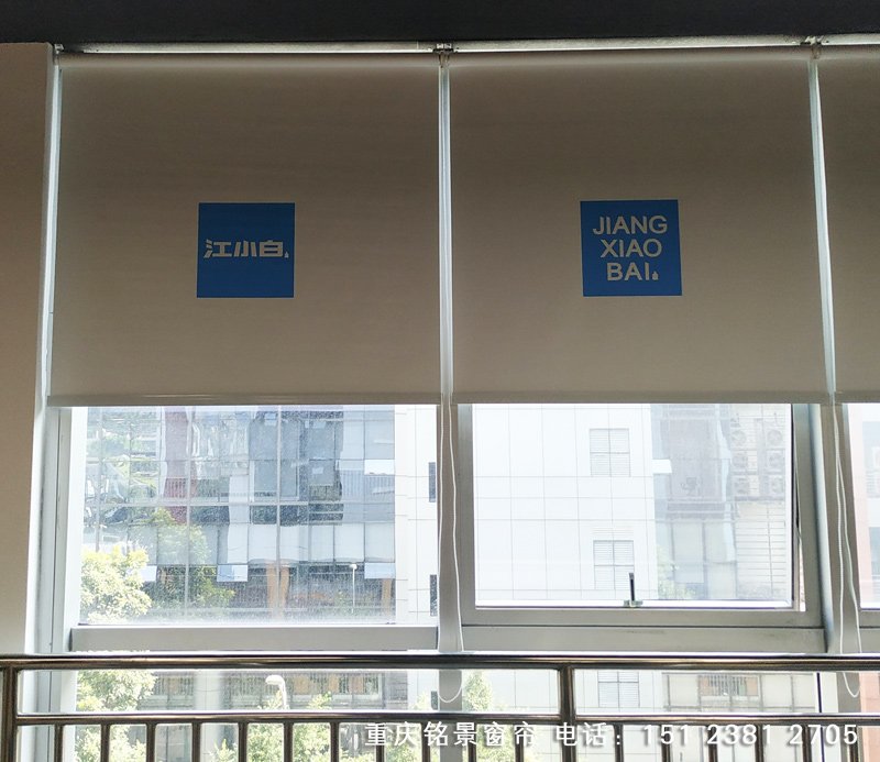 重庆渝北区江小白办公室卷帘印LOGO案例实拍图,客户选择的是全遮光加厚面料,正面采用蓝色LOGO,手动拉珠上。