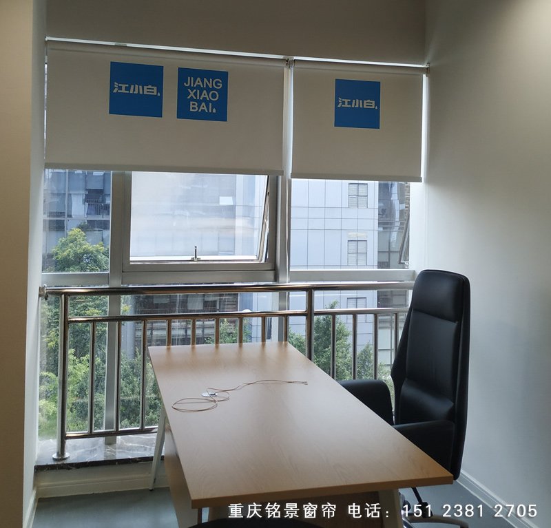 重庆渝北区江小白办公室卷帘印LOGO案例实拍图,客户选择的是全遮光加厚面料,正面采用蓝色LOGO,手动拉珠上。