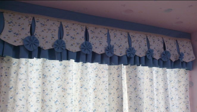 最近完成的实拍案例,分享出来,这里是卧室田园风格窗帘 温馨女儿房蝴蝶结窗幔,,配上多对折和边形平幔,再加上可爱的蝴蝶结, 看起来十分的温馨,布的颜色是蓝色碎花。