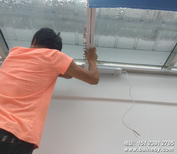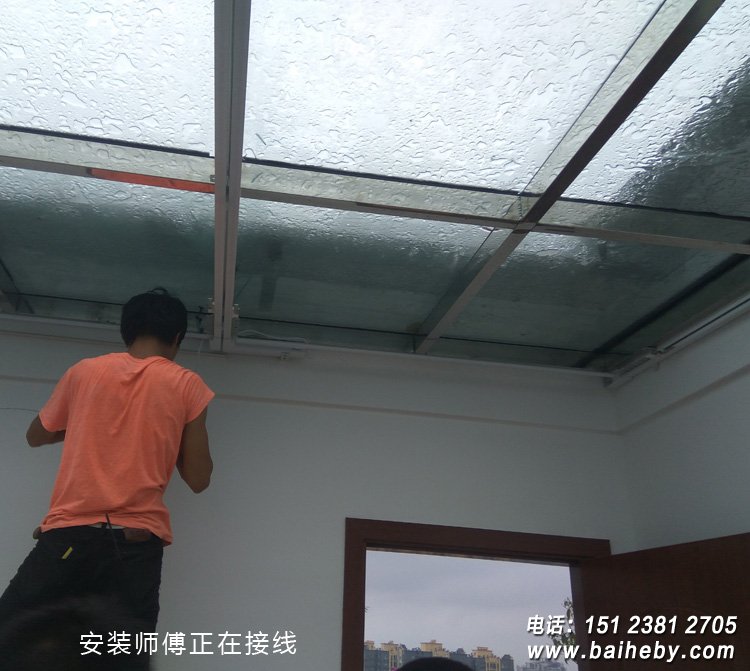 安装师傅正在安装中,,,接电动天棚帘的电线